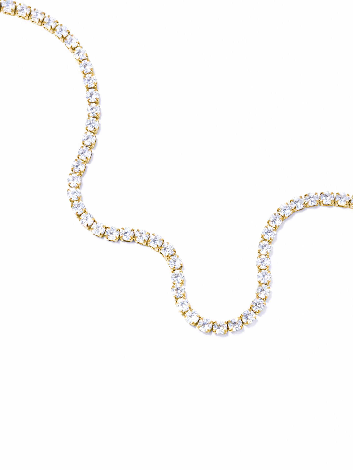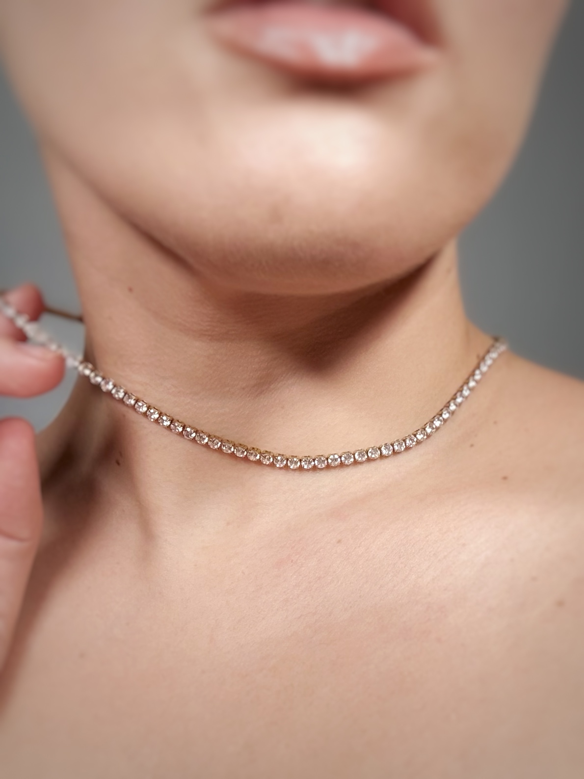 Διαχρονικό κολιέ tennis , στολισμένο με εκθαμβωτικά ζιργκόν που προσδίδουν κομψή λάμψη σε κάθε εμφάνιση. Κατασκευασμένο από υποαλλεργικό ατσάλι, είναι ανθεκτικό και φιλικό προς το δέρμα, ιδανικό για καθημερινή χρήση ή ιδιαίτερες περιστάσεις. Ένα κομμάτι που συνδυάζει minimal πολυτέλεια και διαχρονικό στυλ, ολοκληρώνοντας κάθε look με διακριτική λάμψη.