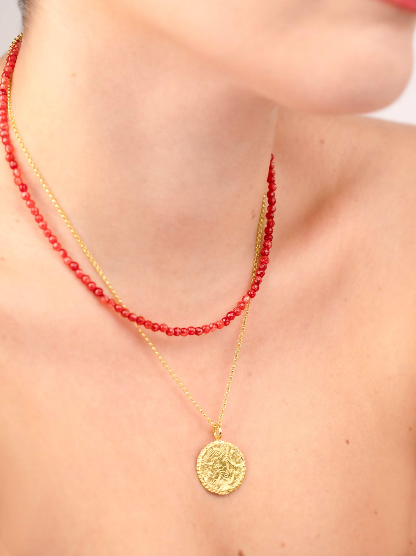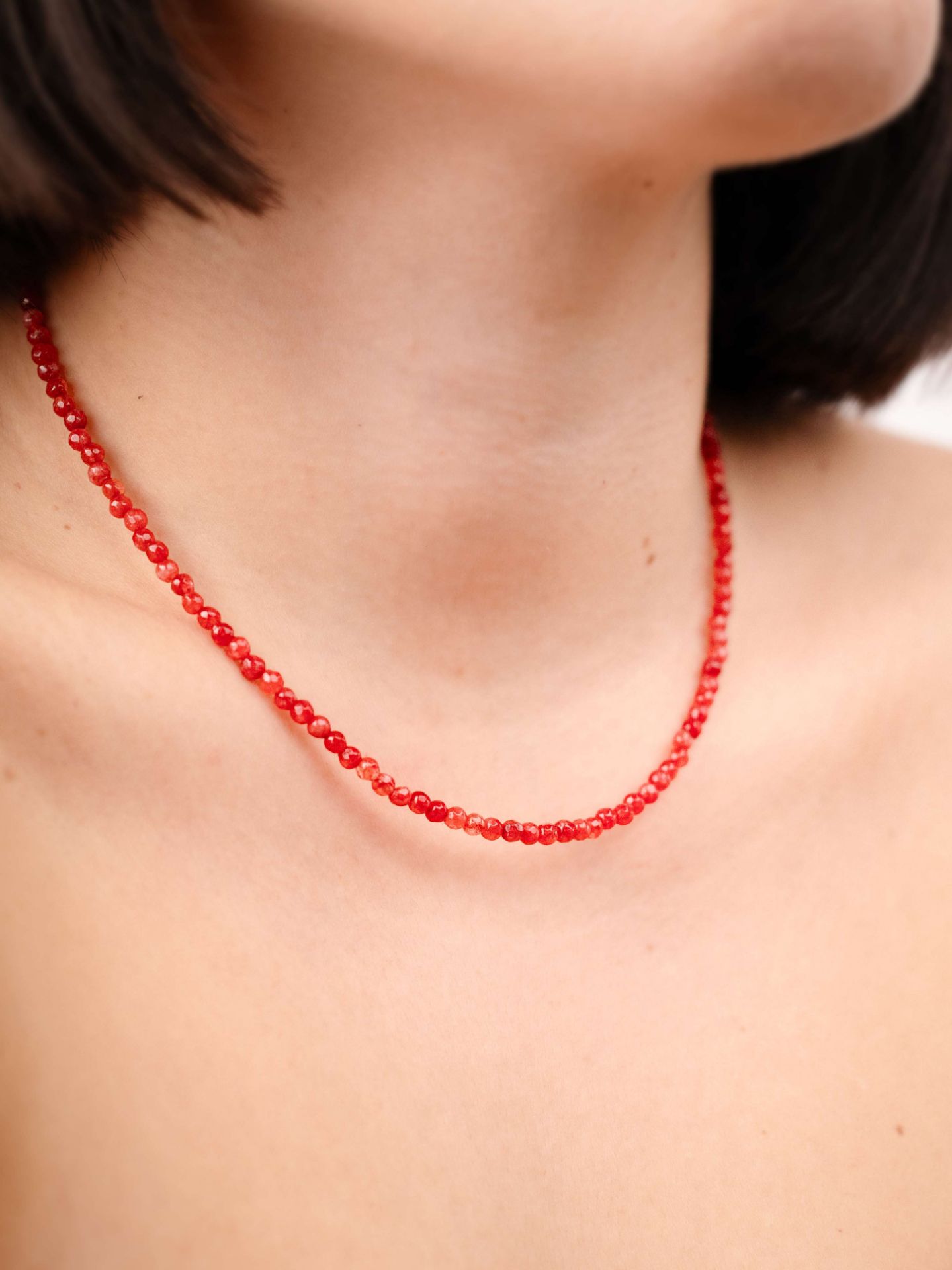 Ένα κομψό, χειροποίητο κολιέ με φυσικές χάντρες κόκκινου αχάτη, σε βαθιά, ζεστή απόχρωση που αγκαλιάζει τέλεια τη φθινοπωρινή και χειμωνιάτικη παλέτα. Ο κόκκινος αχάτης είναι γνωστός για τις τονωτικές του ιδιότητες – λέγεται ότι ενισχύει την ενέργεια, τη ζωτικότητα και το θάρρος. Ένα διακριτικό αλλά εκφραστικό κόσμημα που προσθέτει ένταση και στυλ σε κάθε εμφάνιση.